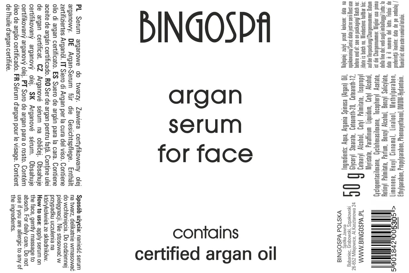 Aqua, Argania Spinosa (Argan) Oil, Glyceryl Stearate, Ceteareth-20, Ceteareth-12, Cetearyl Alcohol, Cetyl Palmitate, Isopropyl Myristate, Paraffinum Liquidum, Cetyl Alcohol, Cyclopentasiloxane, Cyclohexasiloxane, Tocopheryl Acetate, Retinyl Palmitate, Methylparaben, Ethylparaben, Propylparaben, Parfum, Benzyl Alcohol, Benzyl Salicylate, Limonene, Hexyl Cinnamal, Linalool, Phenoxyethanol, DMDM Hydantoin