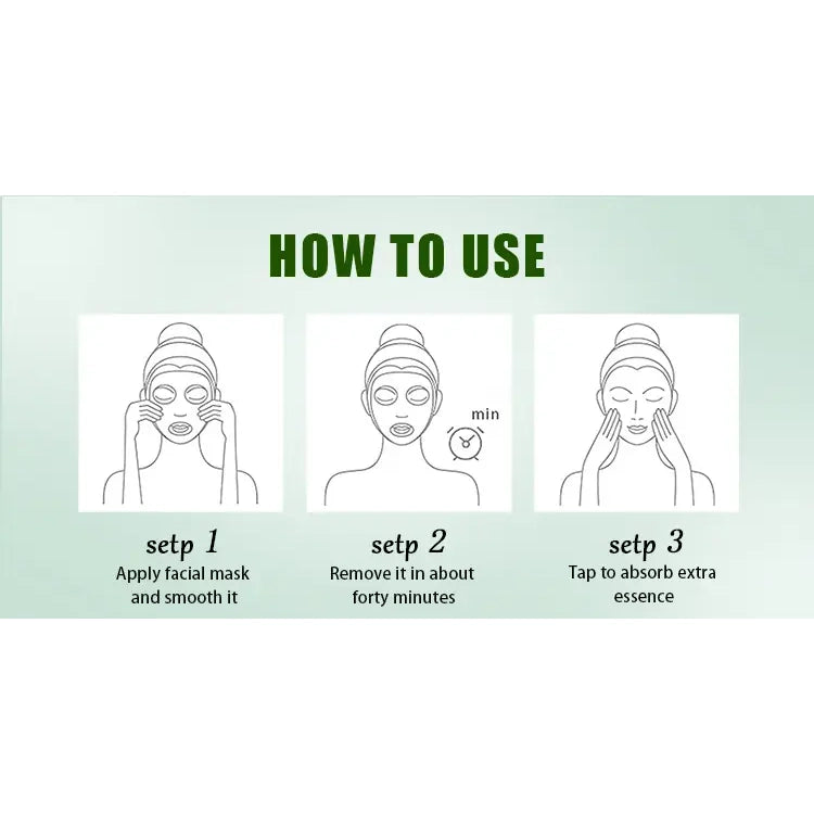 Rens ansigtet grundigt før brug. Påfør masken jævnt – start med den nederste del af ansigtet og fortsæt med den øverste. Lad masken virke i cirka 60 minutter eller indtil den bliver gennemsigtig (typisk efter omkring 45 minutter). Fjern masken og dup forsigtigt overskydende essens ind i huden. Afslut eventuelt med din foretrukne ansigtscreme.