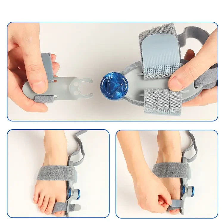 Lindr tryk og afl ast storetåleddet med en justerbar korrigerer, der gradvist fører storetåen mod en mere neutral position. Den bløde silikonepude beskytter knysten, mens remsystemet holder foden stabilt og behageligt på plads.
