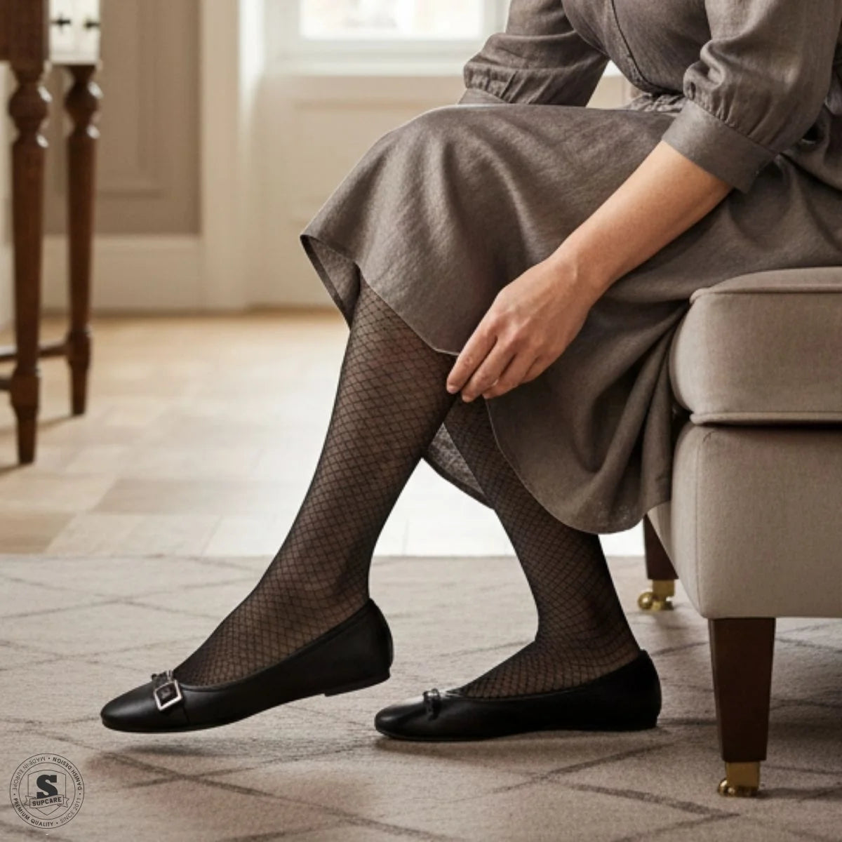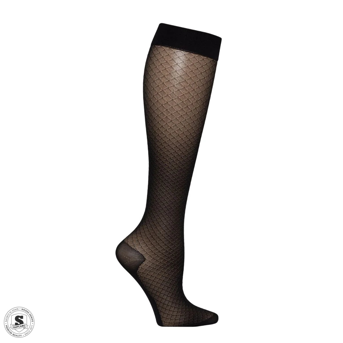 Knæhøje støttestrømper med et elegant mønster, der giver et stilrent og moderne udtryk. Det diskrete design gør, at strømperne passer lige godt til arbejde, hverdag og mere formelle anledninger.