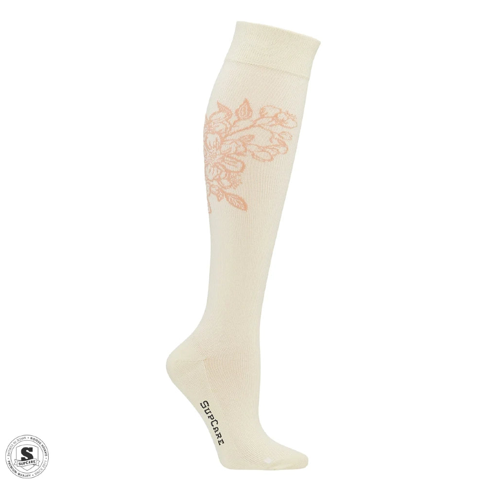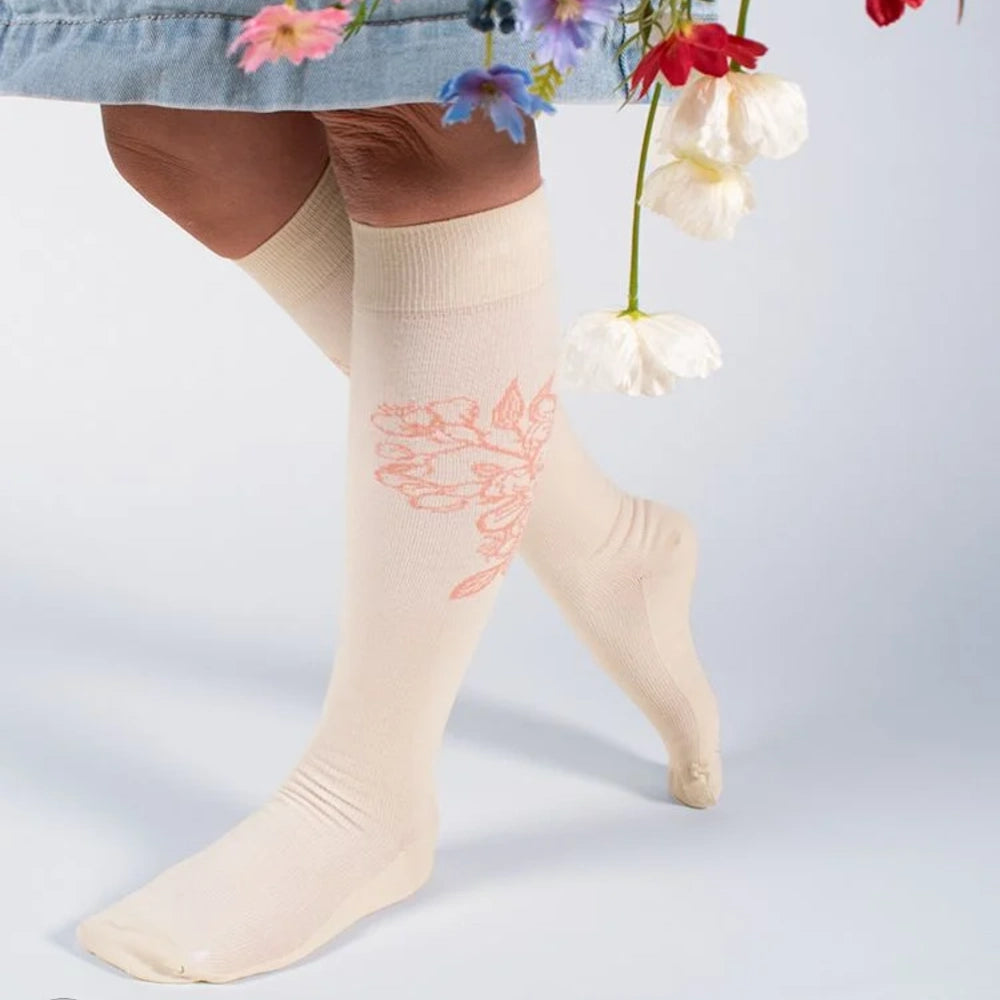 Komfortable og stilrene knæhøje kompressionsstrømper i økologisk bomuld med et elegant blomstermønster. Designet til at give let og behagelig støtte i hverdagen – perfekt til både arbejde og fritid.