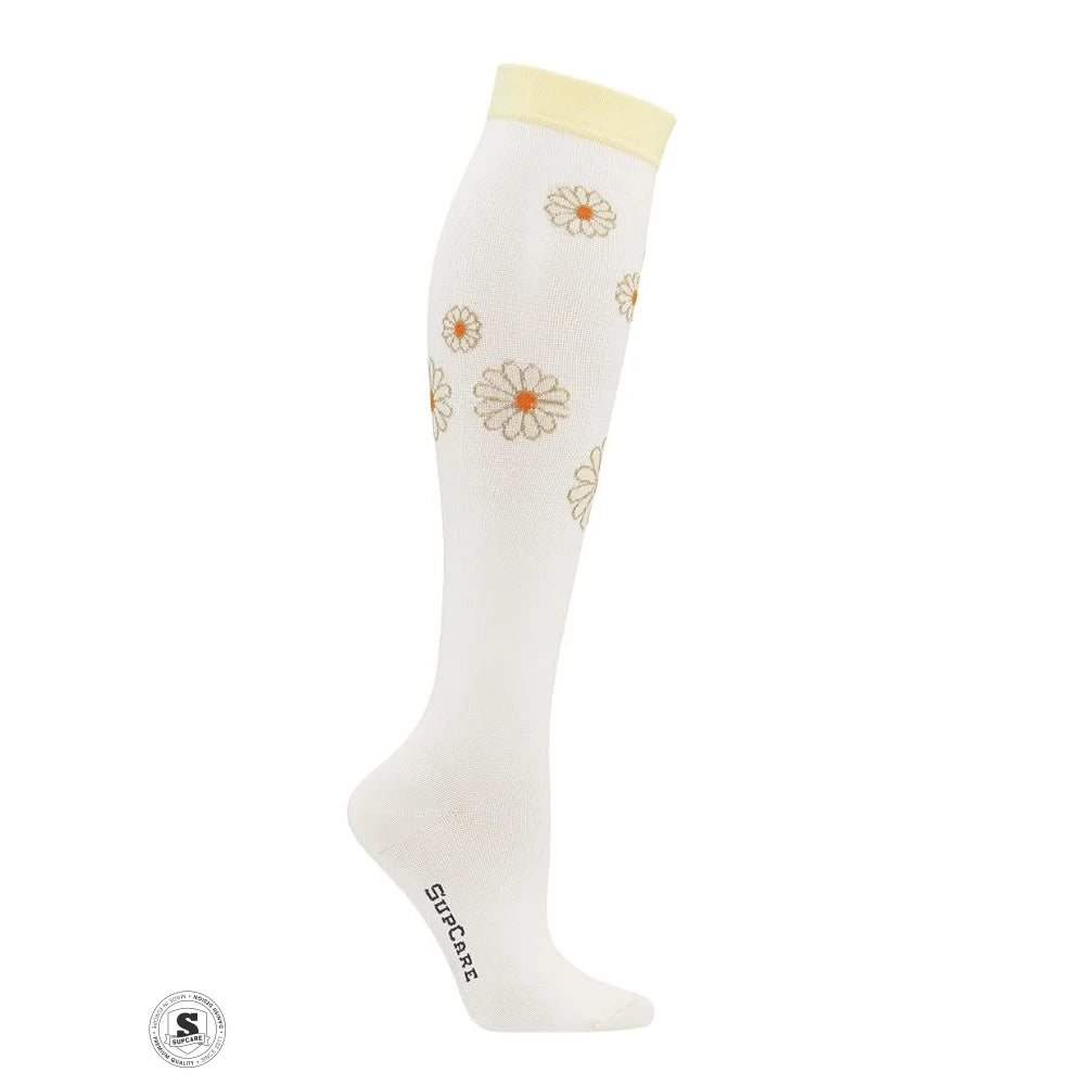 Medicinske kompressionsstrømper i klasse 2, designet med smukke margueritter og udviklet til effektiv støtte i hverdagen. Strømperne kombinerer dokumenteret kompression med høj komfort og et feminint udtryk.