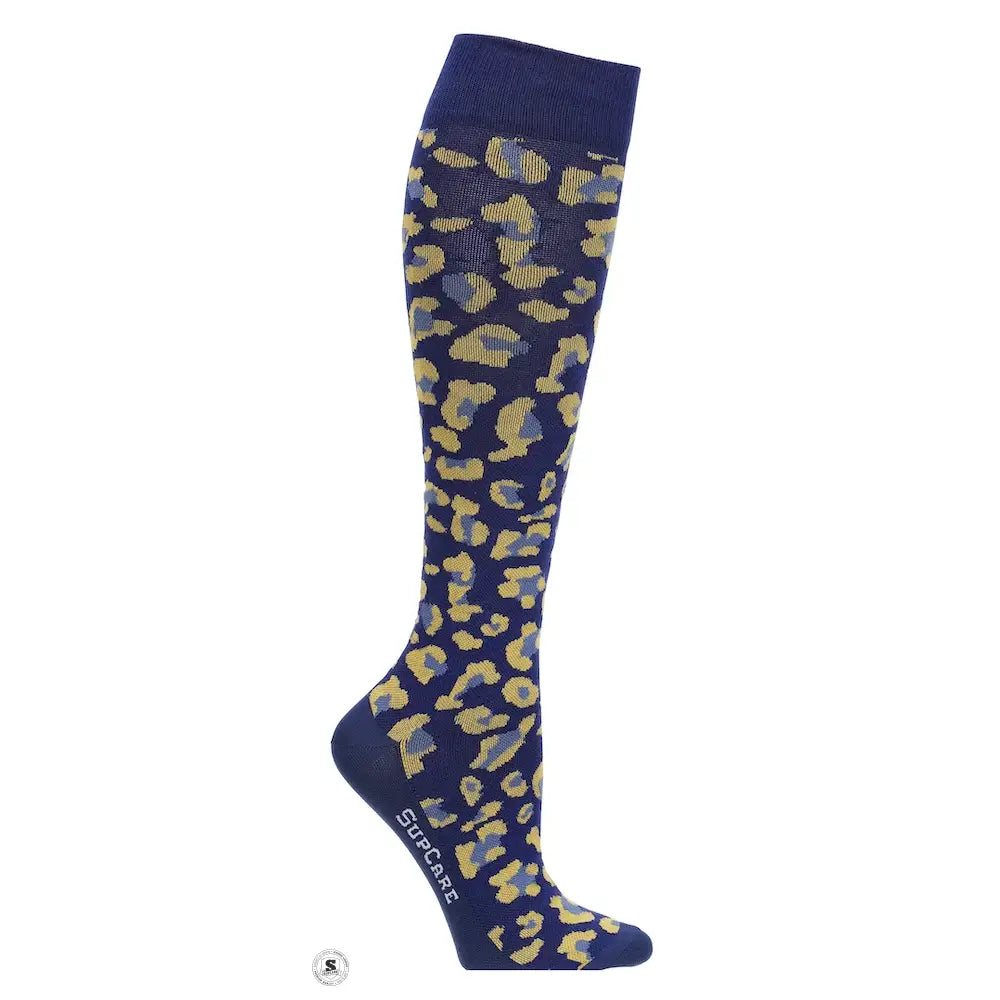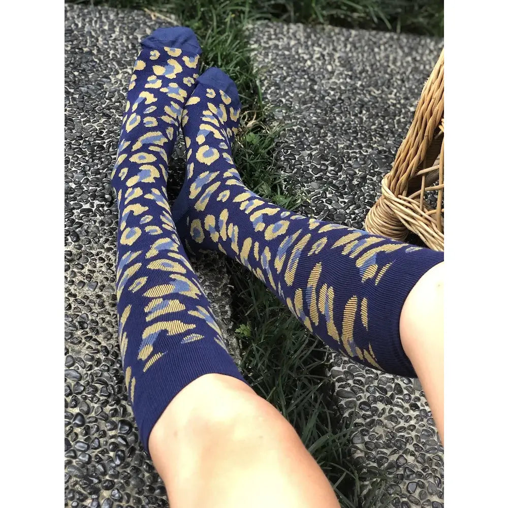 Leopardmønstret støttestrømpe i mørkeblå – Klasse 1 kompression