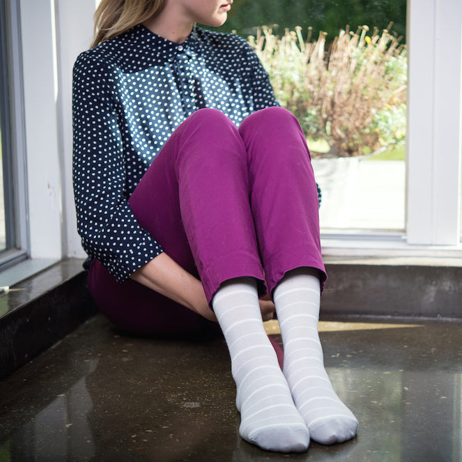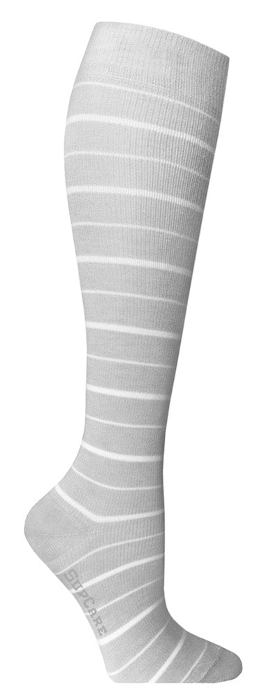 - Lækre grå støttestrømper med fine hvide striber.<br />Indeholder bambus, et kølende naturmateriale <br />Støttesstrømper i behagelig kvalitet og med middel kompression, der passer til det meste tøj