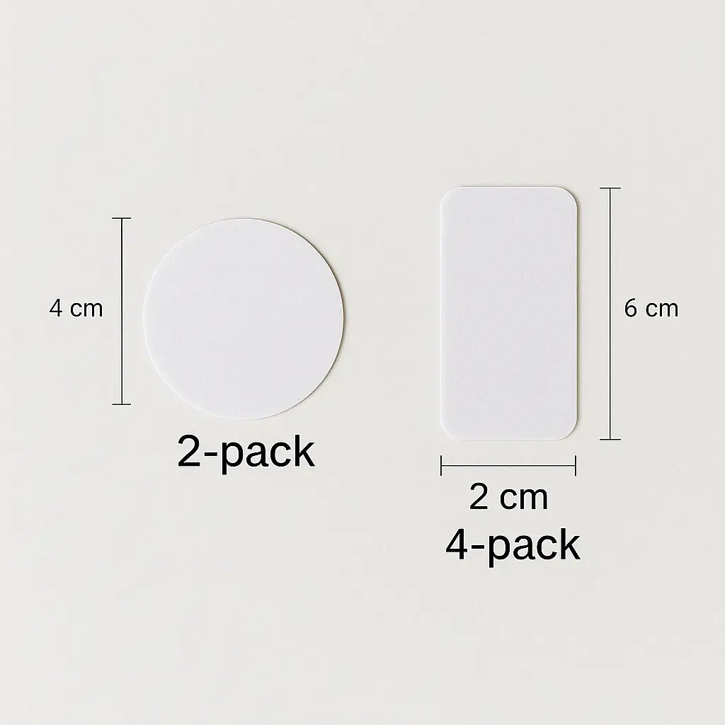 Rengør det slidte område, fjern beskyttelsesfilmen fra lappen og tryk den godt fast. Vælg den runde form (Ø 4 cm) til afrundede områder eller den rektangulære (6 × 2 cm) til større flader. Pakken indeholder 2 runde og 4 rektangulære lapper.