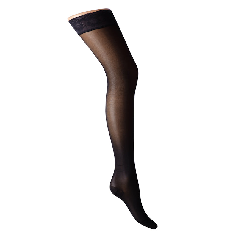 Flotte og elegante lårhøje støttestrømper med silikonekant og medium kompression (klasse 1). Perfekte til dig, der ønsker effektiv støtte kombineret med et let og stilfuldt look – vælg mellem lukket eller åben tå.