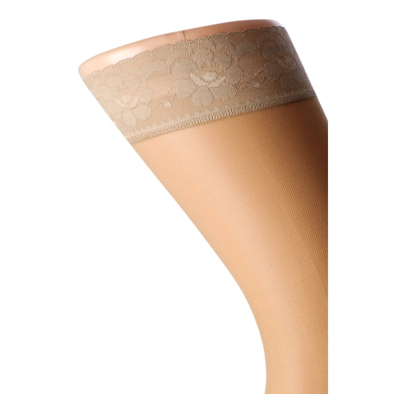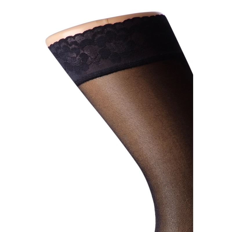 Disse stay-up støttestrømper kombinerer funktionalitet og elegance. De dækker hele benet, men føles lettere og mindre varme end traditionelle støttestrømpebukser. Den integrerede silikonekant med dekorativ blonde sikrer, at strømperne bliver siddende stabilt på låret hele dagen.