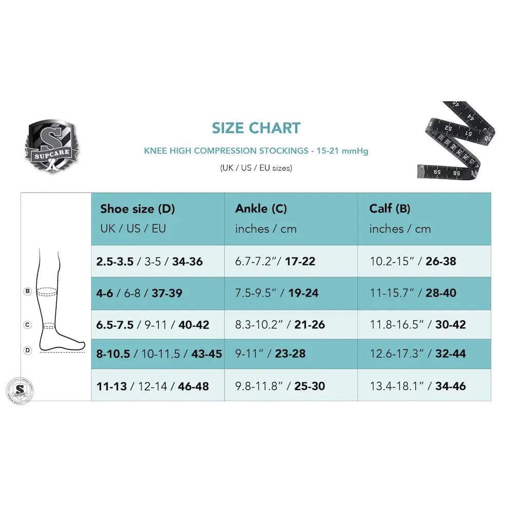 Anvendelse: Tag strømperne på om morgenen, når benene ikke er hævede. Sørg for, at materialet ligger glat uden folder for optimal effekt. Mål omkredsen af anklen (smalleste sted) og læggen (bredeste sted) for korrekt størrelse.