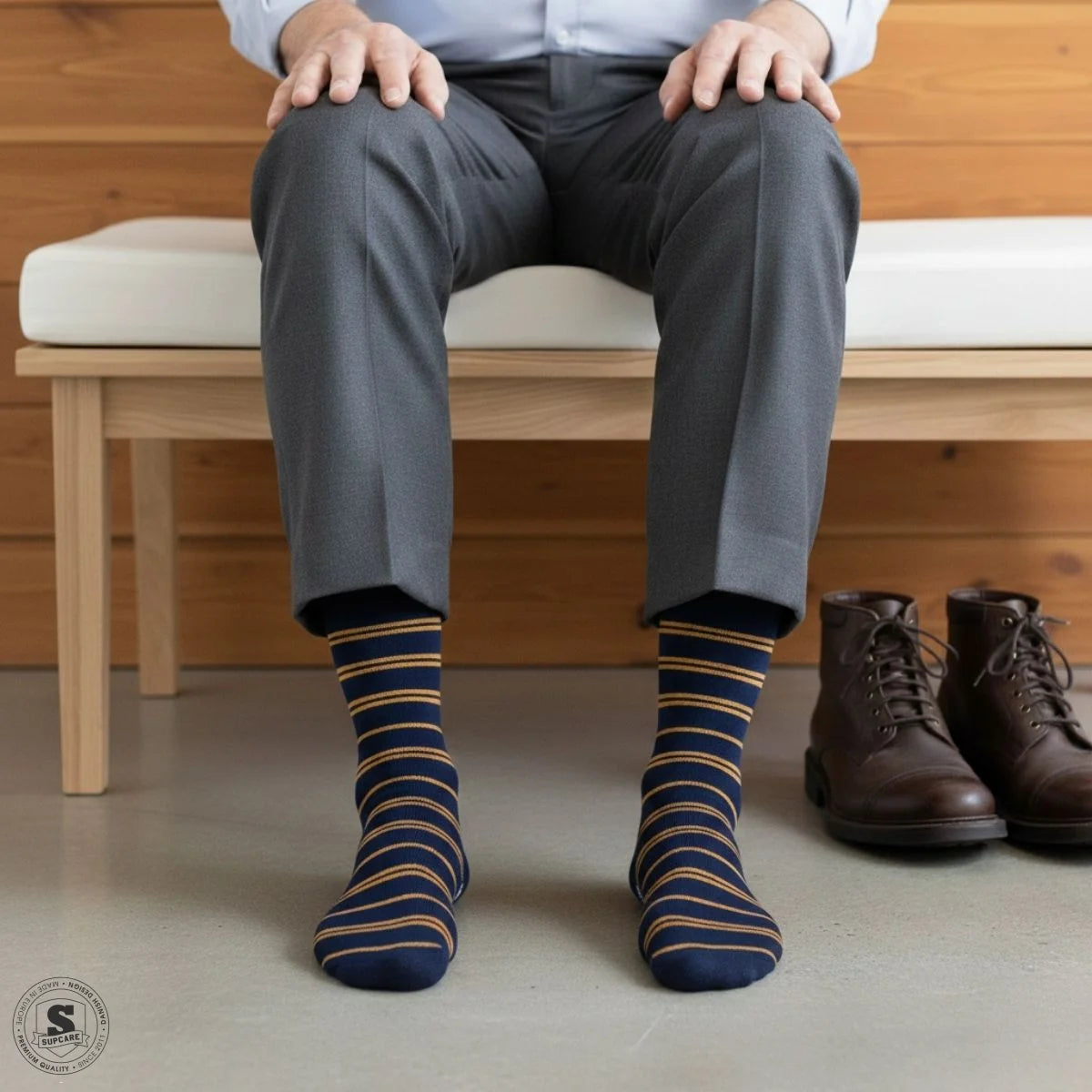 Den marineblå farve sammen med de okkergule striber giver strømperne et klassisk og stilrent udseende, som passer lige godt til hverdag som til arbejde.