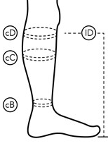 Mål omkredsen på din ankel (cB), læg (cC) samt ca. 2 cm under knæet (cD). Målene bør tages om morgenen, hvor fødder og ben ikke er hævede. Se målevejledning i produktbillederne og vælg størrelse ud fra størrelsestabellen.